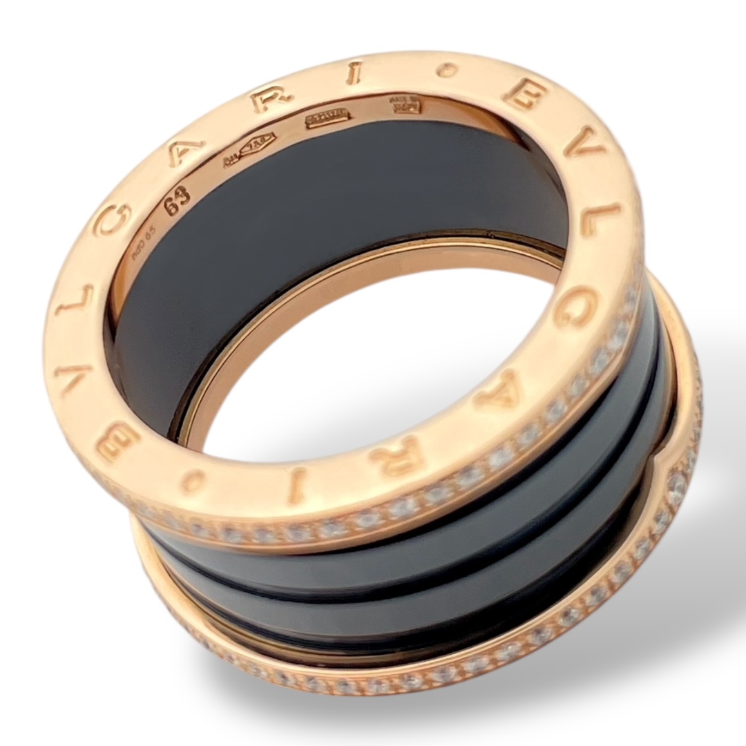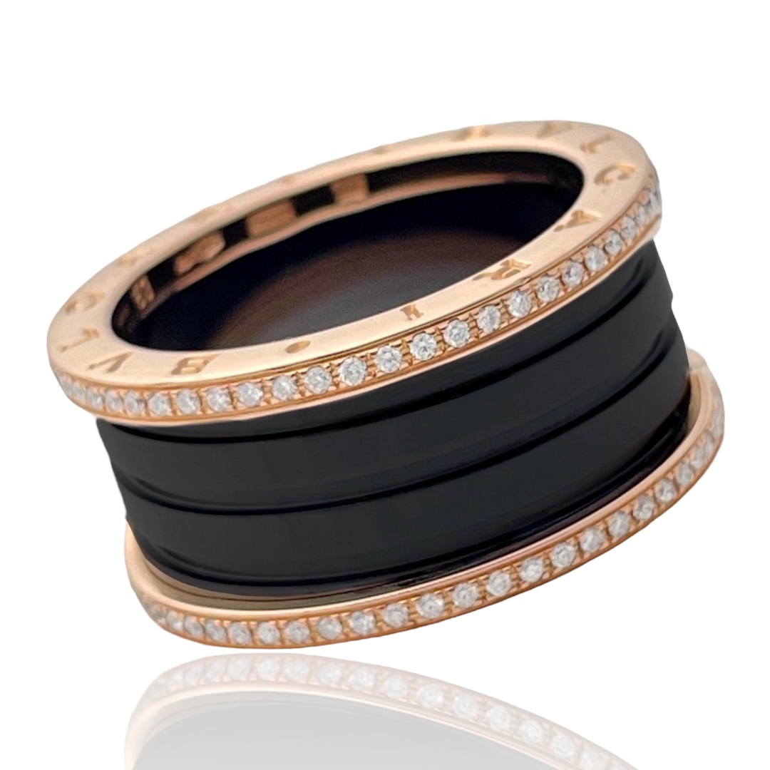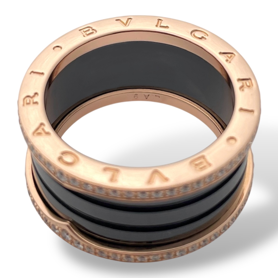 B.zero1 four-band ring with two 18 kt rose gold loops black ceramic spiral and Diamonds